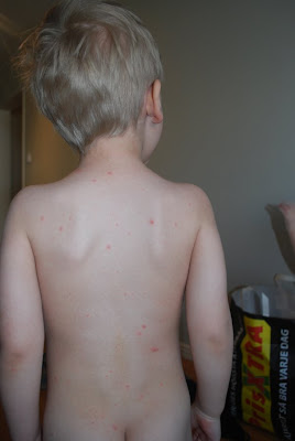 LÀgger in nÄgra bilder pÄ Alexander frÄn idag. Han har fÄtt mer koppor men klagar nÀstan inget alls. Han kliar sig lite i huvudet men annars verkar det inte klia sÄ mycket. Han har inte feber heller. TyvÀrr Àr Sebastian vÀldigt dÄlig med hög feber och mycket snor.