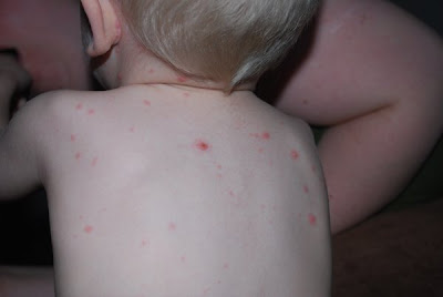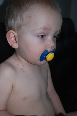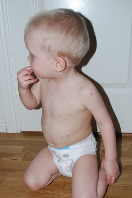 Sebastian har det värre med sina koppor än Alexander. Sebastian har fått bakom öronen, många i huvudet, massor på snoppen, på pungen och i rumpan. Inte bara på rumpan utan i rumpan. Stackars liten. Jag har varit hemma med honom idag, imorgon är det Jantes tur. Nu hoppas jag det inte kliar för mycket i natt. Han sov två timmar idag på dagen, man märker att han inte är kry.